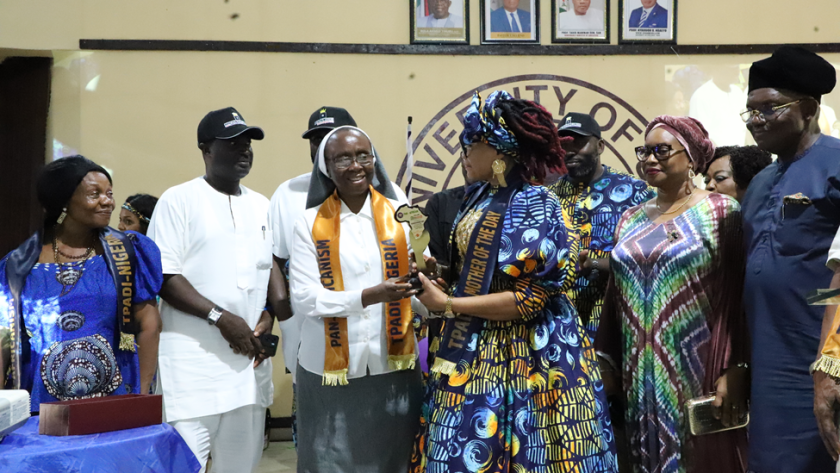 The YRAC chairman, Mrs. Margaret Udoh receiving 2024 PAN-African mother award, and her induction into the Advisory Board of the PAN-African Dialogue Institute, University of Uyo, Akwa Ibom State, Nigeria.